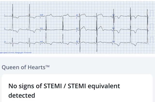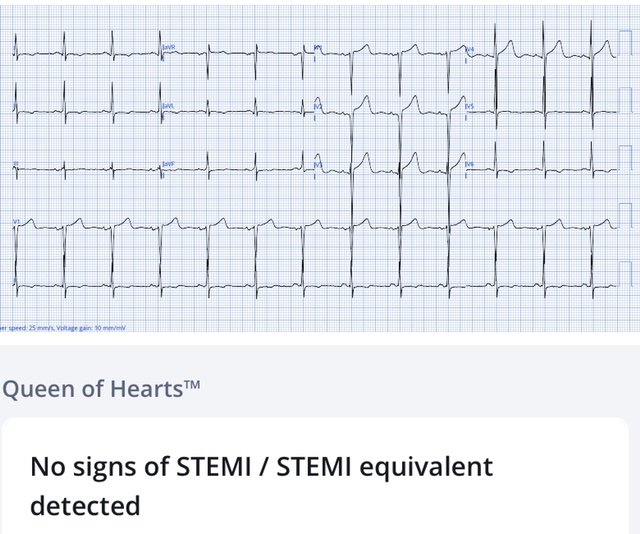 The ECG was repeated on arrival, revealing the full voltages, and now the Queen is confident there are no signs of OMI on the ECG
