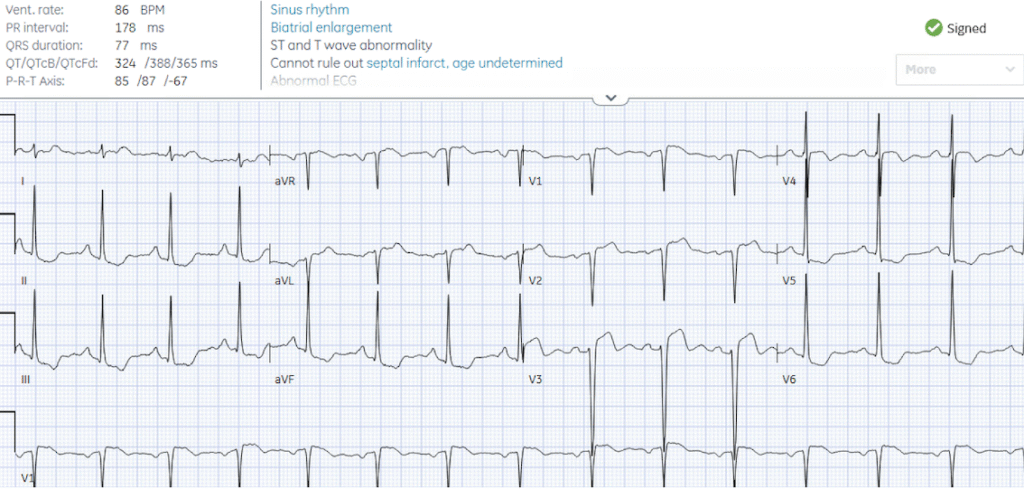 There are large and overlapping voltages, with discordant and proportional ST/T waves secondary to LVH. Cath lab was activated by the emergency physician but canceled by cardiology. Serial troponins were stable at 17ng/L (normal <16 in females) and echo diagnosed hypertrophic cardiomyopathy.