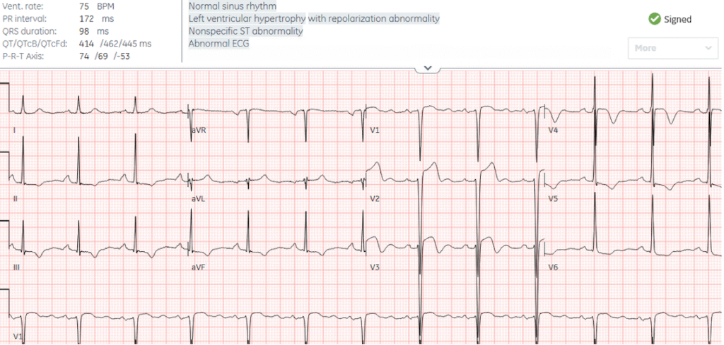 Discharge diagnosis was “STEMI” because of rapid reperfusion, even though no ECG had a final interpretation of STEMI, because STEMI criteria cannot be applied in the presence of LVH.