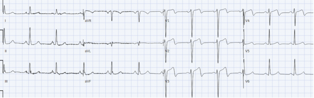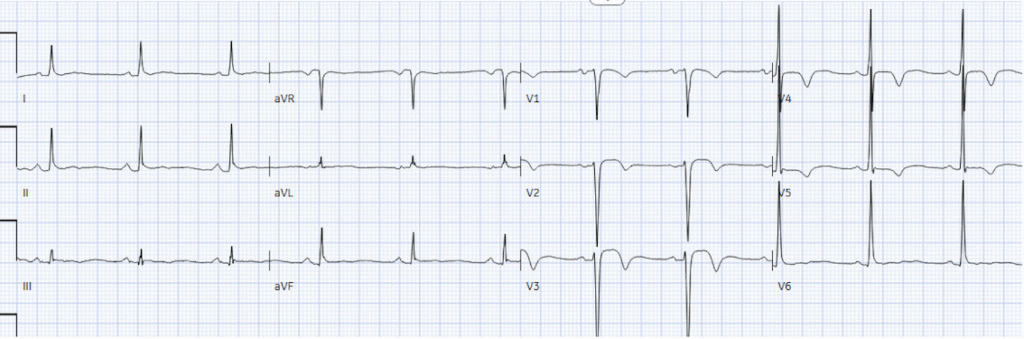But the patient was admitted as ‘high risk NSTEMI’, and after troponin rose to 12,000 two hours later the patient was taken to cath lab. Door-to-cath was 5hr40 minutes. There was 100% mid LAD occlusion, and peak troponin was 30,000 ng/L, with EF 48%. But because the patient was admitted as NSTEMI with delayed reperfusion, the discharge diagnosis remained NSTEMI despite a 100% occlusion. Next day ECG showed more obvious reperfusion T wave inversion: