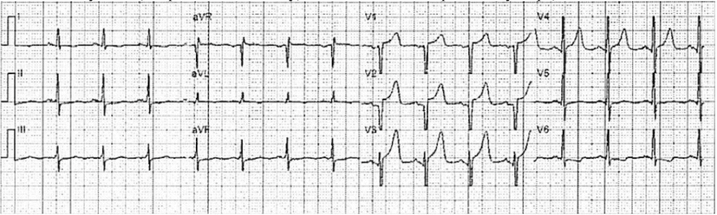 There’s LVH with an S wave in V2 of 35, which would require 9mm of ST elevation to meet Armstrong criteria.