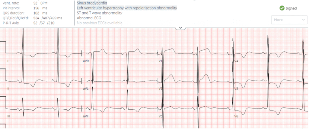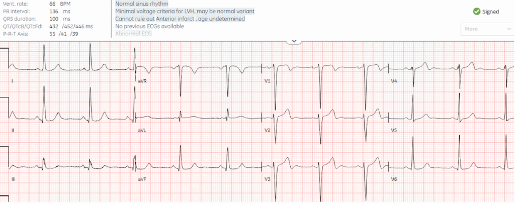 There’s voltage cutoff, which is very common in prehospital ECGs and this makes it difficult to assess proportionality, but there’s overlapping voltages in V4-5 and the morphology of ST segments is asymmetric. Despite the voltage cutoff the Queen finds no signs of OMI, but with low confidence.