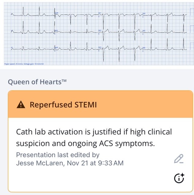 Queen of Hearts identified LAD OMI with ECG signs of reperfusion, but clinically the patient still had pain at the time of the ECG. The ECG was repeated 15 minutes later, when the patient reported reduction but still ongoing pain
