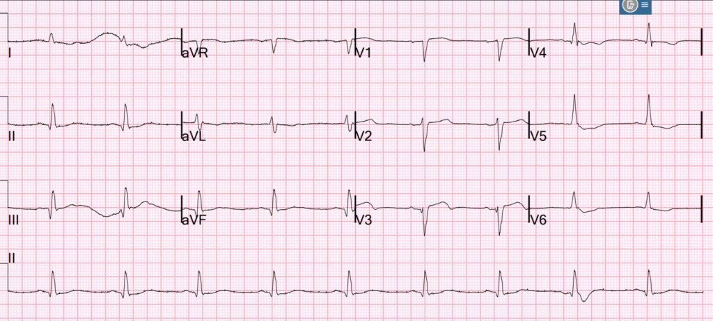 • I added question marks to the ST-T waves in leads V1,V5,V6 — as I was not sure what to make of these findings.