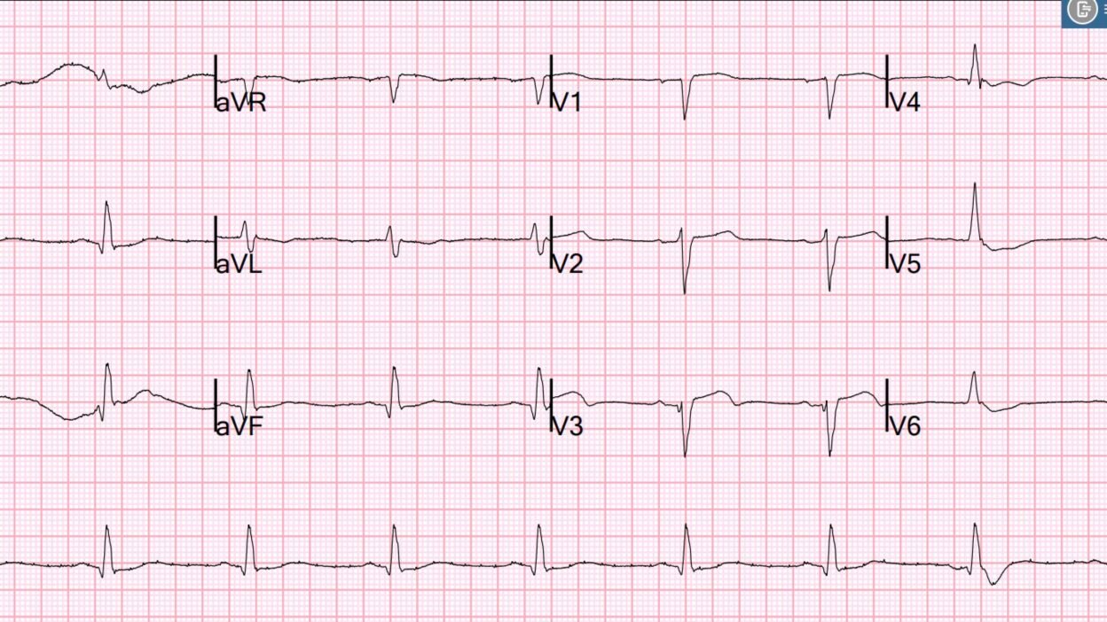 • I added question marks to the ST-T waves in leads V1,V5,V6 — as I was not sure what to make of these findings.