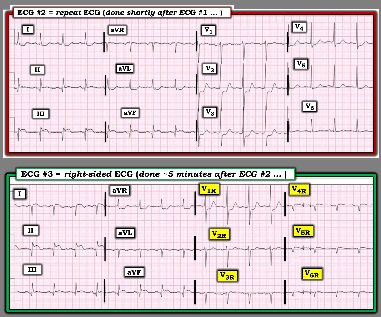 The 3rd ECG recorded in today’s case (shown above in Dr. Smith’s discussion) — was with right-sided leads. In Figure-2 below — I’ve put this 3rd ECG together with ECG #2 to facilitate assessment of these right-sided leads, which are used to determine if there is also RV infarction.
