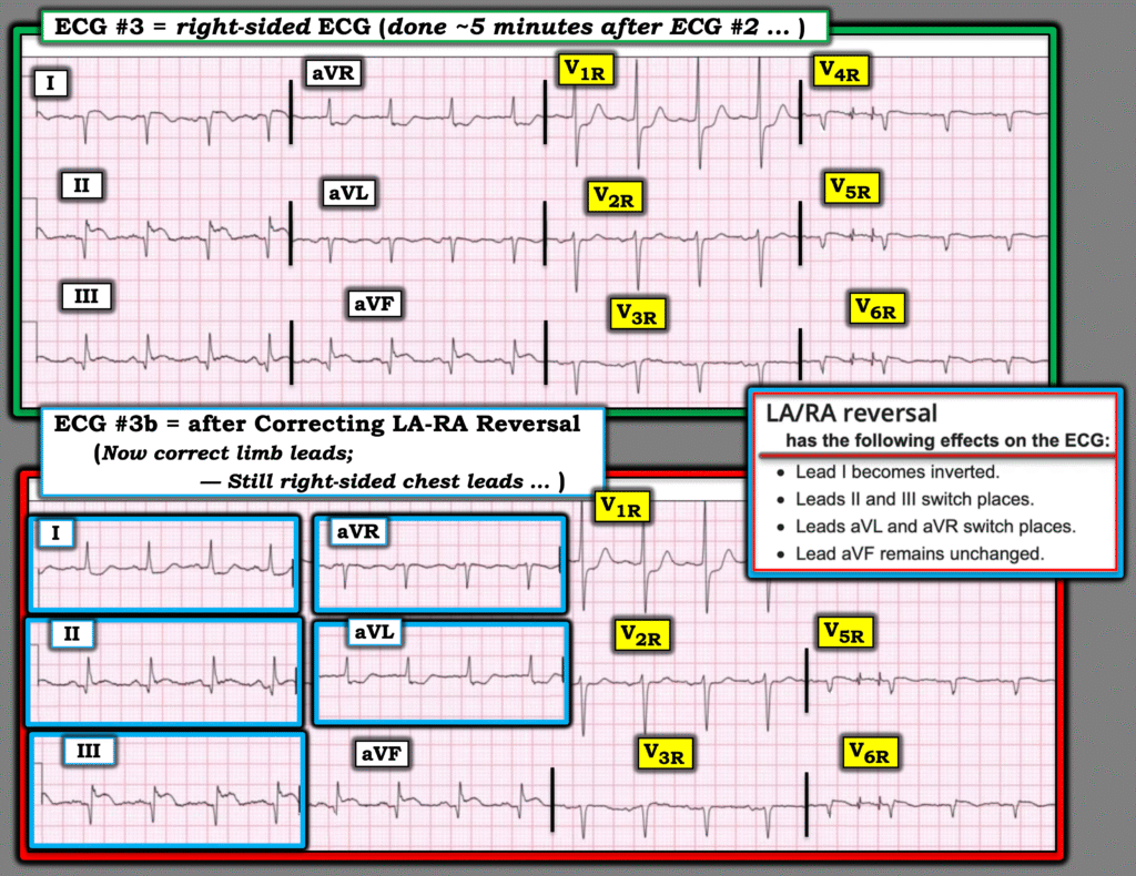 - Note in Figure-2 — that the limb leads look very different in ECG #3 compared to how they looked in ECG #2 (ie, Lead I shows an all-negative QRS in ECG #3 — and an all-positive QRS in lead aVR!). This is because in addition to reversing the chest leads — the technician mistakenly also switched the LA and RA electrodes!