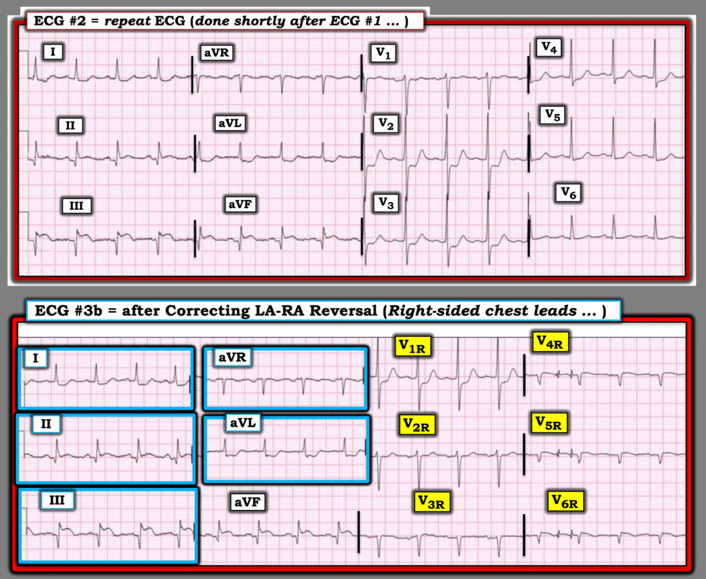 In Figures-3 and -4 below — I correct for the LA-RA reversal that was mistakenly done when the technician recorded right-sided leads. I then compare ECG #2 with what the right-sided ECG should have looked like.