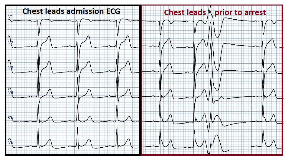 Chest leads on admission (left) compared to chest leads prior to cardiac arrest which occured the day after admission. Notice the widespread distribution and markedly changed amplitude of J waves prior to cardiac arrest!
