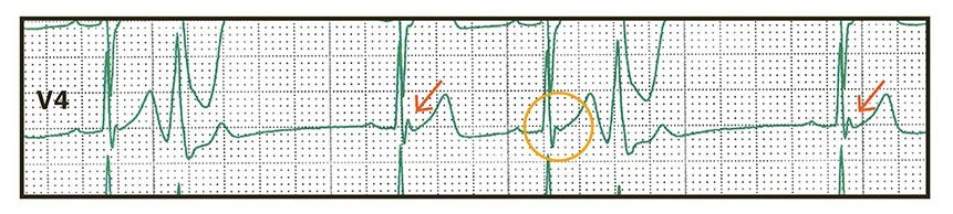 Rhythm strip from lead V4 immediately prior to cardiac arrest. QRS complexes preceded by a post-extrasystolic pause, and thus a prolonged RR interval, show more prominent J waves (arrows) compared with QRS complexes not preceded by RR interval prolongation (circle). This phenomenon is called post-extrasystolic J-wave augmentation and is a marker of arrhythmic risk in ERS (2).