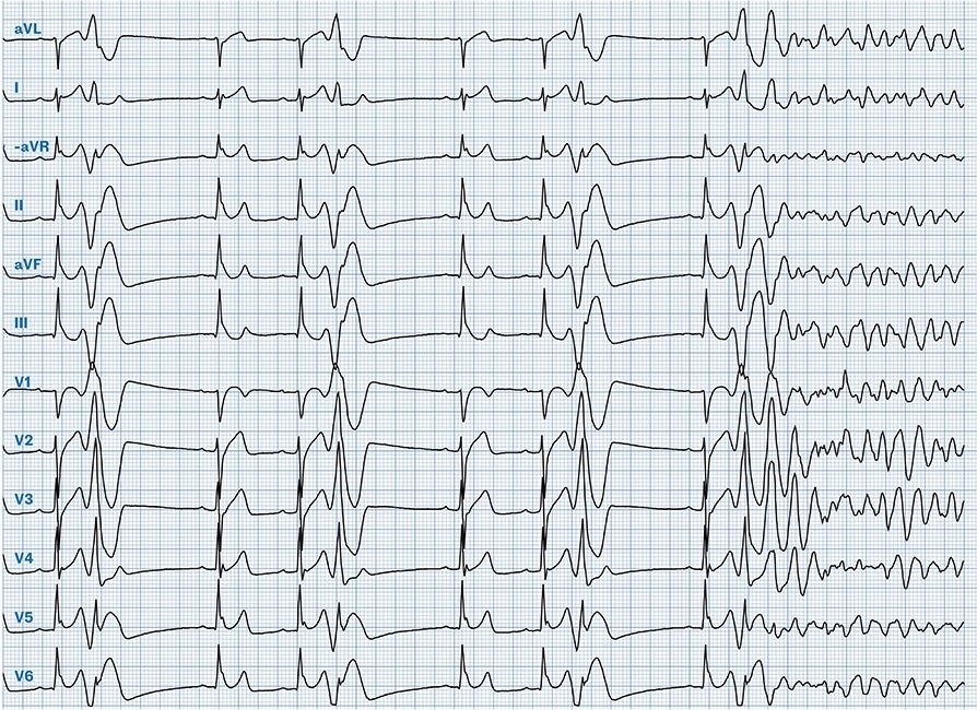 This patient was diagnosed with Early Repolarization Syndrome (ERS). ERS is an arrhythmia syndrome in which early repolarization pattern on the ECG is associated with malignant ventricular arrhythmias or sudden cardiac arrest. It is essentially the “malignant” subset of early repolarization. To make the diagnosis of ERS it is required to have Early Repolarization Pattern (ERP) in a patient with documented polymorphic VT or ventricular fibrillation and a structurally normal heart. Other causes of malignant arrhythmia must be ruled out to diagnose ERS (1). ERS is a diagnosis of exclusion which should not be arrived at without a thorough diagnostic work up. If an extensive work up does not provide any other apparent cause of PMVT or V-fib and the patient has ERP in the ECG — then ERS is diagnosed.