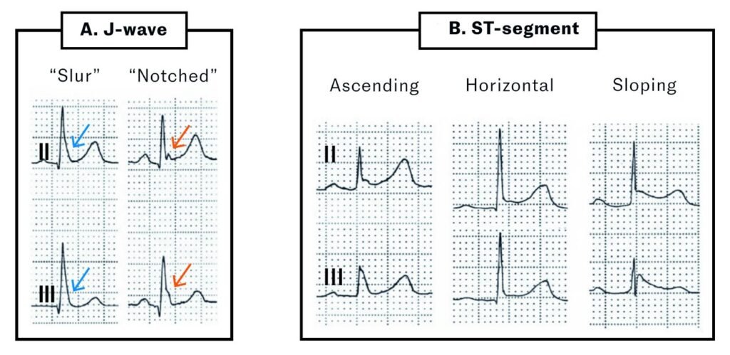 Different manifestations of early repolarization. Modified from Antzelevitch et al. A) The J wave may be well-defined (red arrow) or appear as a distortion of the terminal portion of the QRS complex, with the J wave ‘buried’ at the end of the complex (blue arrow). B) ST-segment elevation is common in early repolarization patterns but is not an absolute criterion. The ST segment may be ascending, horizontal or descending with the descending pattern more strongly being linked to arrhythmias.
