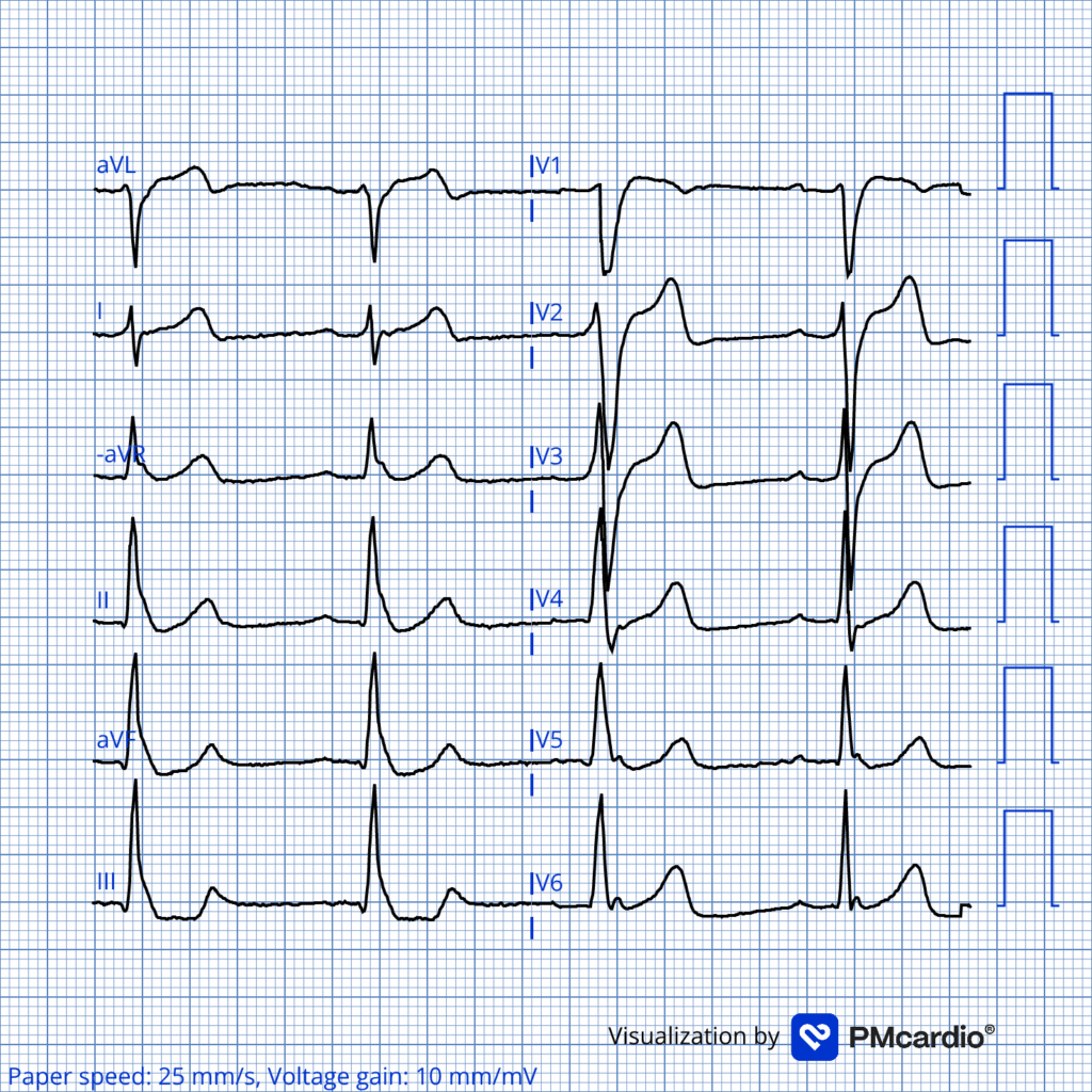 A man in his early 30s was found unresponsive in bed by his wife. She immediately initiated CPR. Upon arrival, emergency medical services found the patient in V-fib. ROSC was achieved after approximately 15 minutes of resuscitation. The patient remained unresponsive and was intubated. The following ECG was recorded post-ROSC.