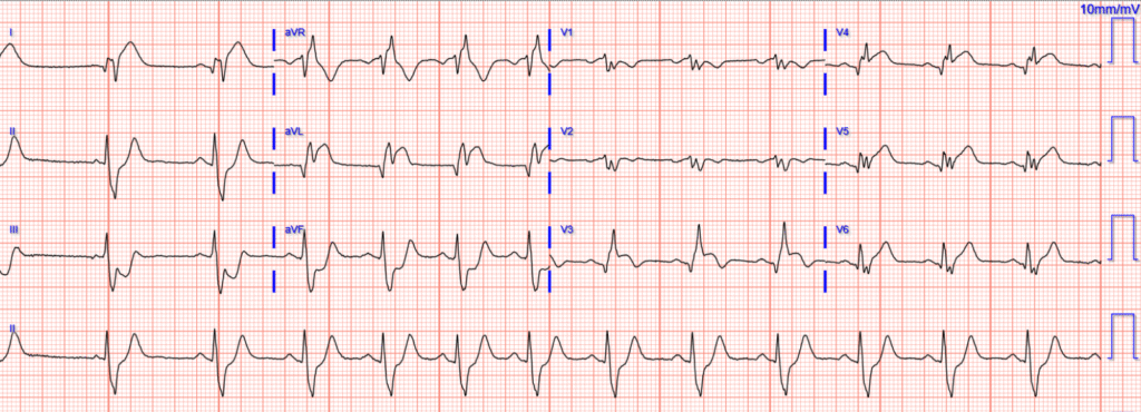 Still very obvious, but now with likely RBBB, LAFB, and precordial lead misplacement.