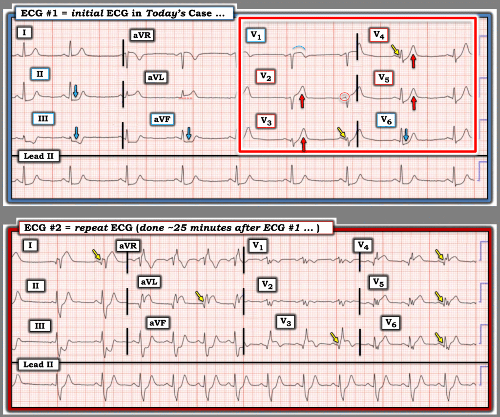 • The above bullet noted — the obvious dramatic increase in ST segment elevation and depression in multiple leads is such, that even if there is an error in lead placement — a “STEMI” can be finally verified. (One can only wonder how much time might have passed until the ECG was repeated — if not for the astute ED physician who did so within 25 minutes).