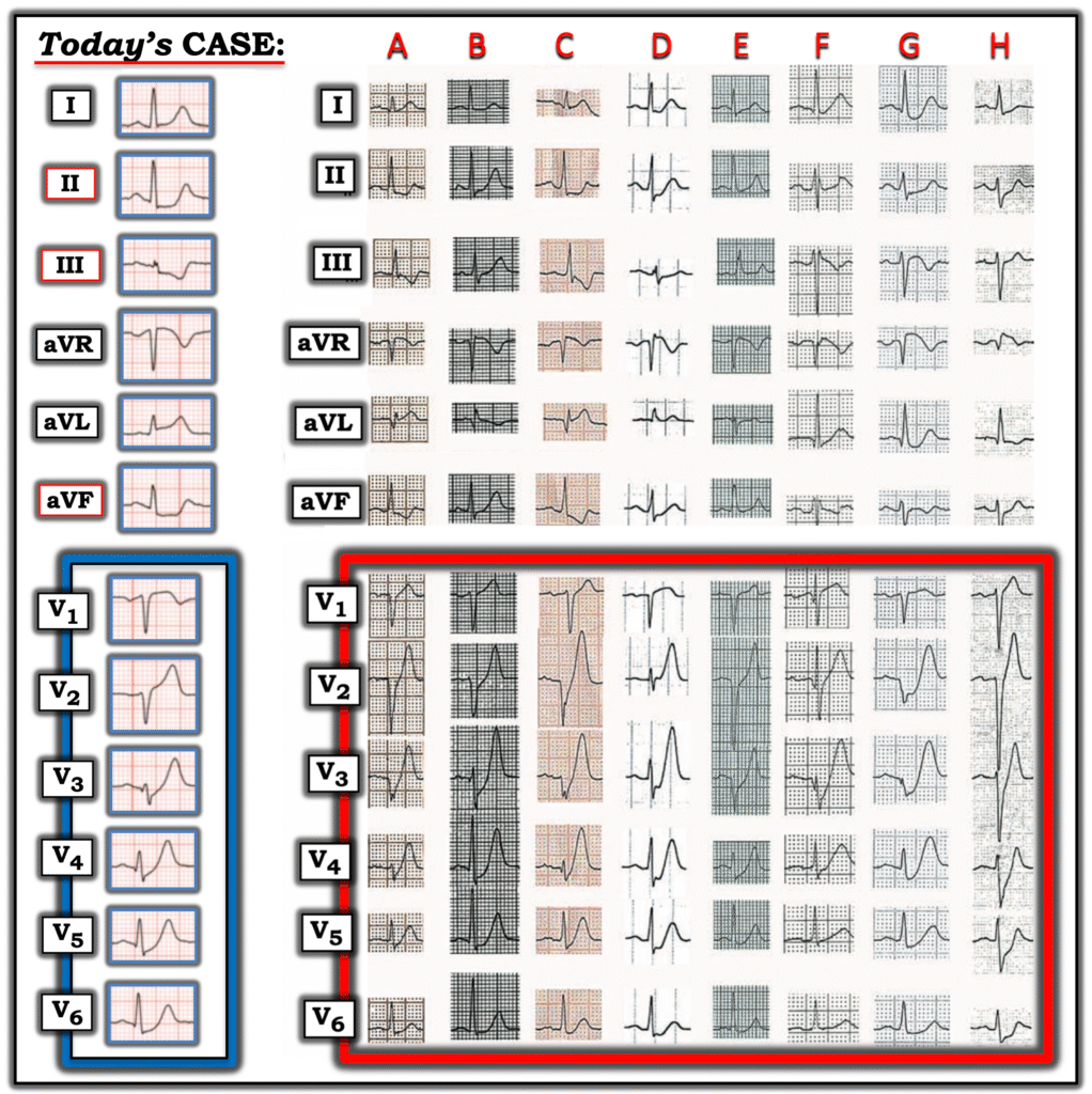 • Focus on the 6 chest leads in today’s tracing (Left panel — within the BLUE rectangle) — reveals a memorable ST-T wave picture comparable to that seen in the 8 illustrative deWinter patients (within the RED rectangle). This pattern should be embedded in our brain to facilitate instant recognition.