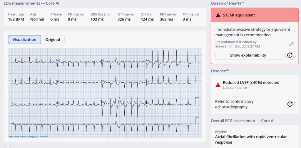 Smith continues: In this case, the STD is very deep, and so subendocardial ischemia is less likely than OMI. Indeed, when submitted to the Queen of Hearts, she diagnosed OMI. For contrast, see this case from Nov 23 2025, in which STD V1-V4 was much less profound, and all due to atrial fibrillation with RVR, and the Queen of Hearts got it right (Not OMI).
