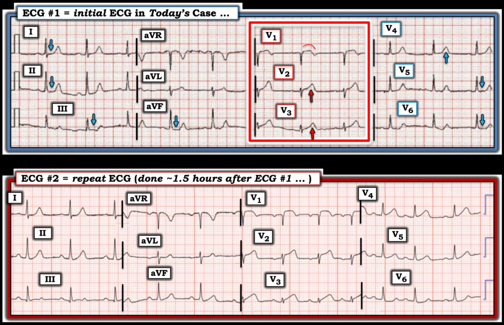 Figure-1: Comparison between the initial ECG in today’s case (which I’ve labeled) — with the repeat ECG done ~1.5 hours later .