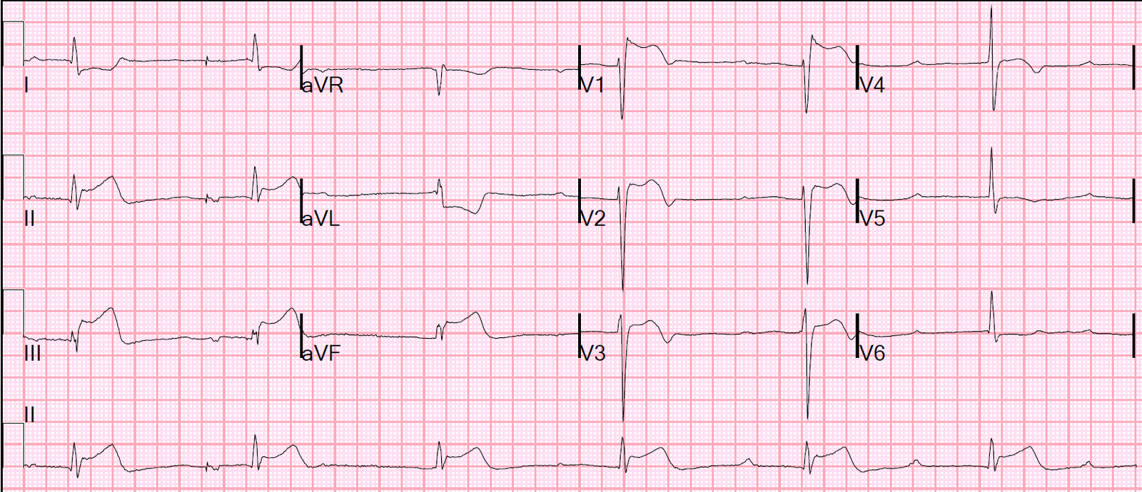 | Now it is clearly 3rd degree AV block. There is clearly ST elevation in V1 (and now also V2) confirming right ventricular involvement, and confirming that prehospital leads were reversed. This is such a large RV infarct that the ST elevation extends all the way to V3, which is often called a “Pseudoanteroseptal MI” (See more cases of pseudoanteroseptal MI) |