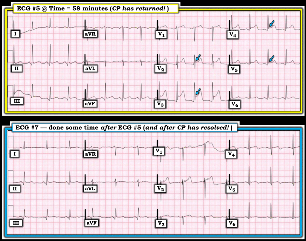 He then arrived in the ED and had recurrent chest pain. This is recorded at t = 58 minutes. So this is ECG 5 recorded in the ED.