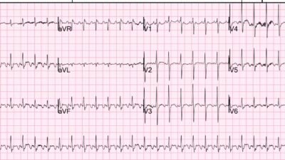 This is a stable ECG. Patient is pain free and clearly has Wellens’ syndrome: 1) pain free episode following an episode of angina, typical Pattern A (biphasic, terminal T-wave inversion with an initial upsloping ST Segment) findings, preserved R-waves. Pattern B is has deep symmetric T-wave inversion without the initial upwardly sloping ST Elevation. Pattern A evolves into Pattern B.