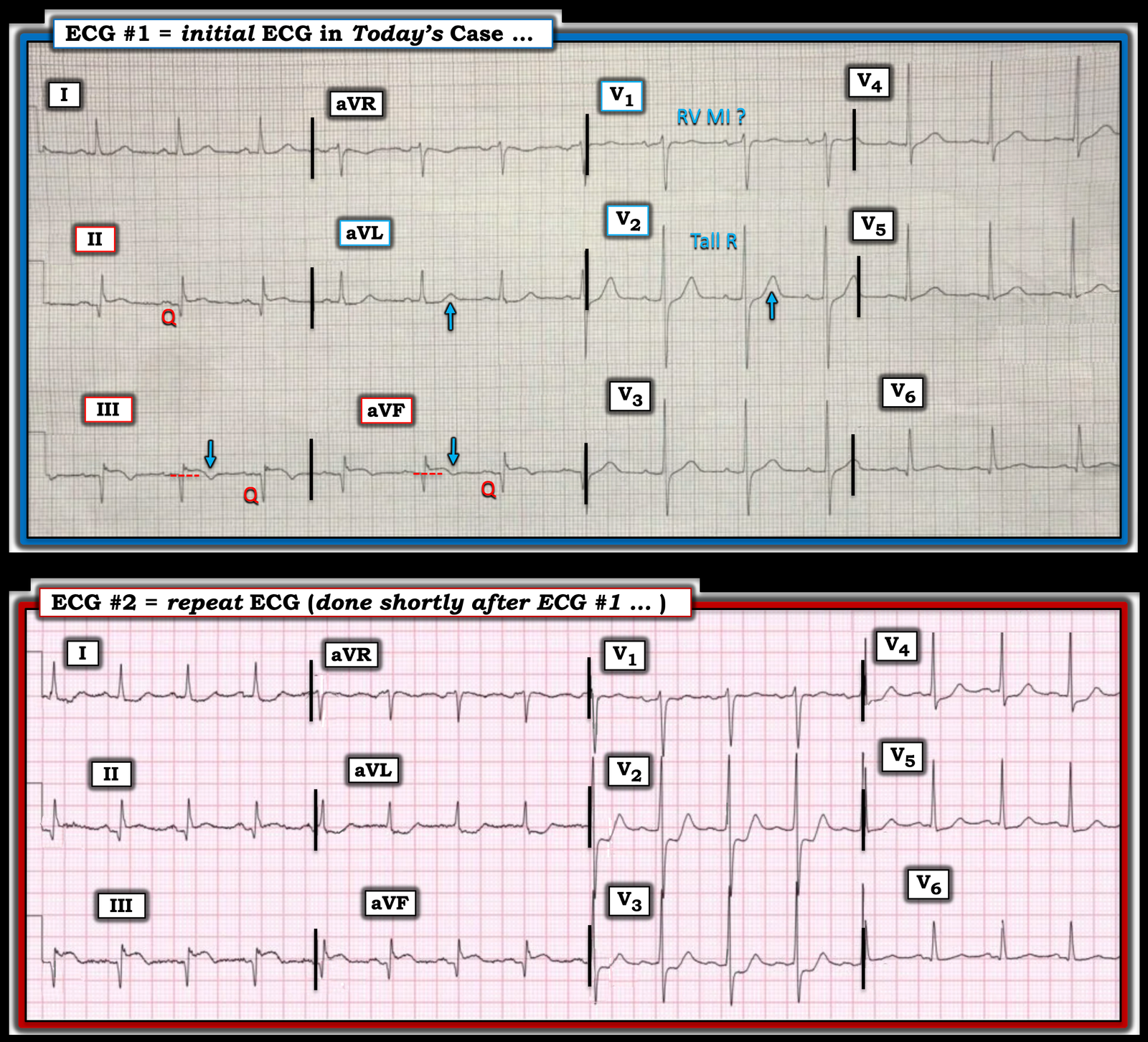 Lead-by-lead comparison in Figure-1 between the repeat ECG and the initial ECG, shows that within the space of a few minutes — there have been “dynamic“ ST-T wave changes.