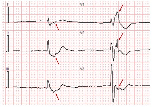 Interpretation ECG #2 The first QRS is likely to be a junctional escape beat. For the remaining ECG, there is clearly atrial activity before each QRS. There is an RBBB conduction pattern and borderline right axis deviation. The RBBB is not, however, typical in appearance. In every lead there are not-so-subtle deflections toward the end of the QRS. This deflection is most easily appreciated in lead V2. In the figure below, red arrows mark what I believe to be epsilon waves in leads V1-V3, as well as in leads I, II and III.