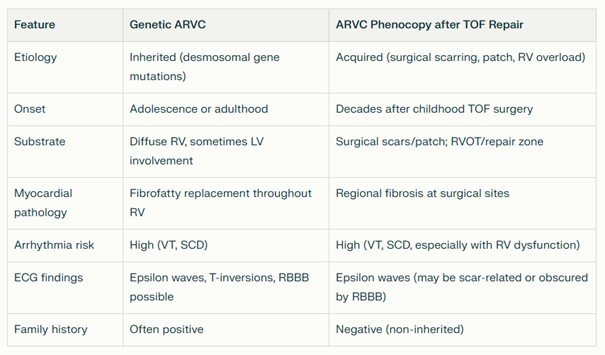 ARVC phenocopy usually appears decades after intial surgery in ToF patients in the absence of familial gene mutations. (See Figure 1 for a comparison between genetic ARVC and ARVC Phenocopy).