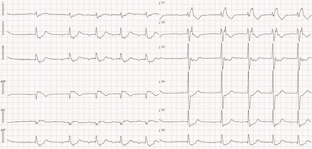 There are several different causes of WCT originating from the RV. The most common cause is RVOT VT. In RVOT VT there is an inferior axis, which we do not see in today’s case. For an example of RVOT VT — have a look at this case. Because the axis is NOT inferior, it is very unlikely that this is RVOT VT.