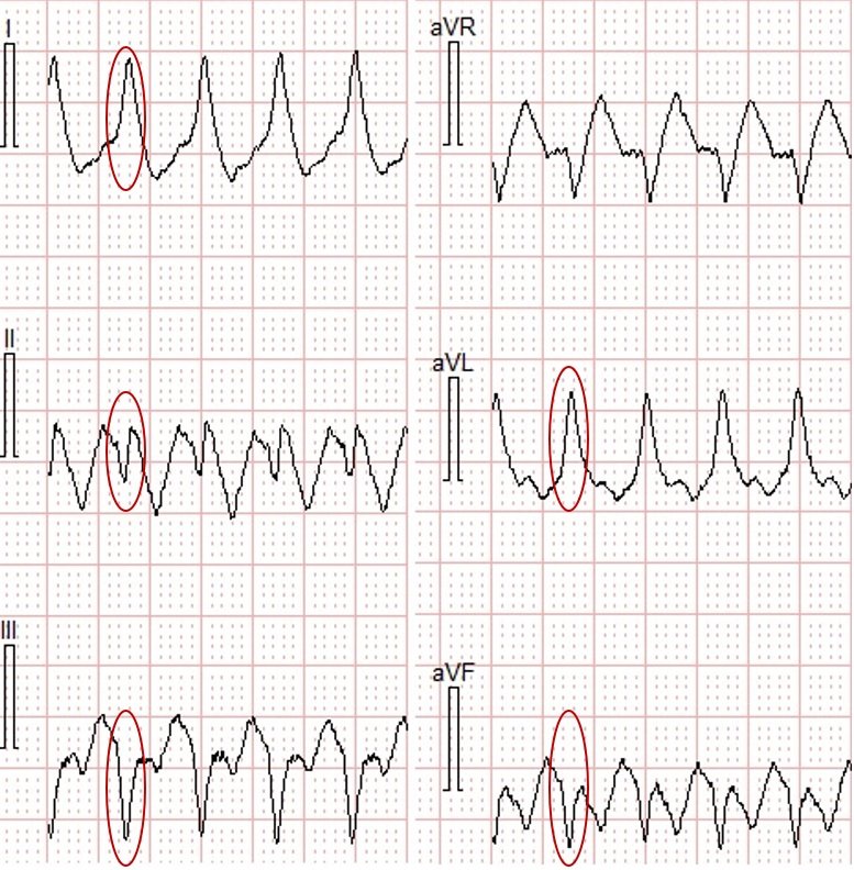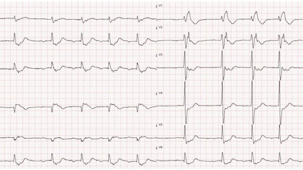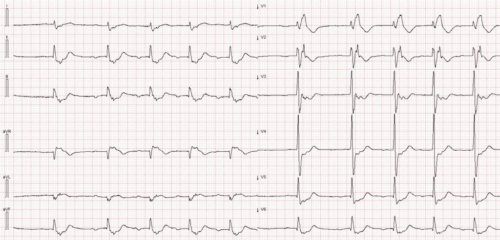 This ECG documenting the arrhythmia has already been obtained and can be scrutinized at a later point in time. The patient was sedated and successfully cardioverted. After cardioversion, the patient stabilized quickly with the repeat ECG shown below.