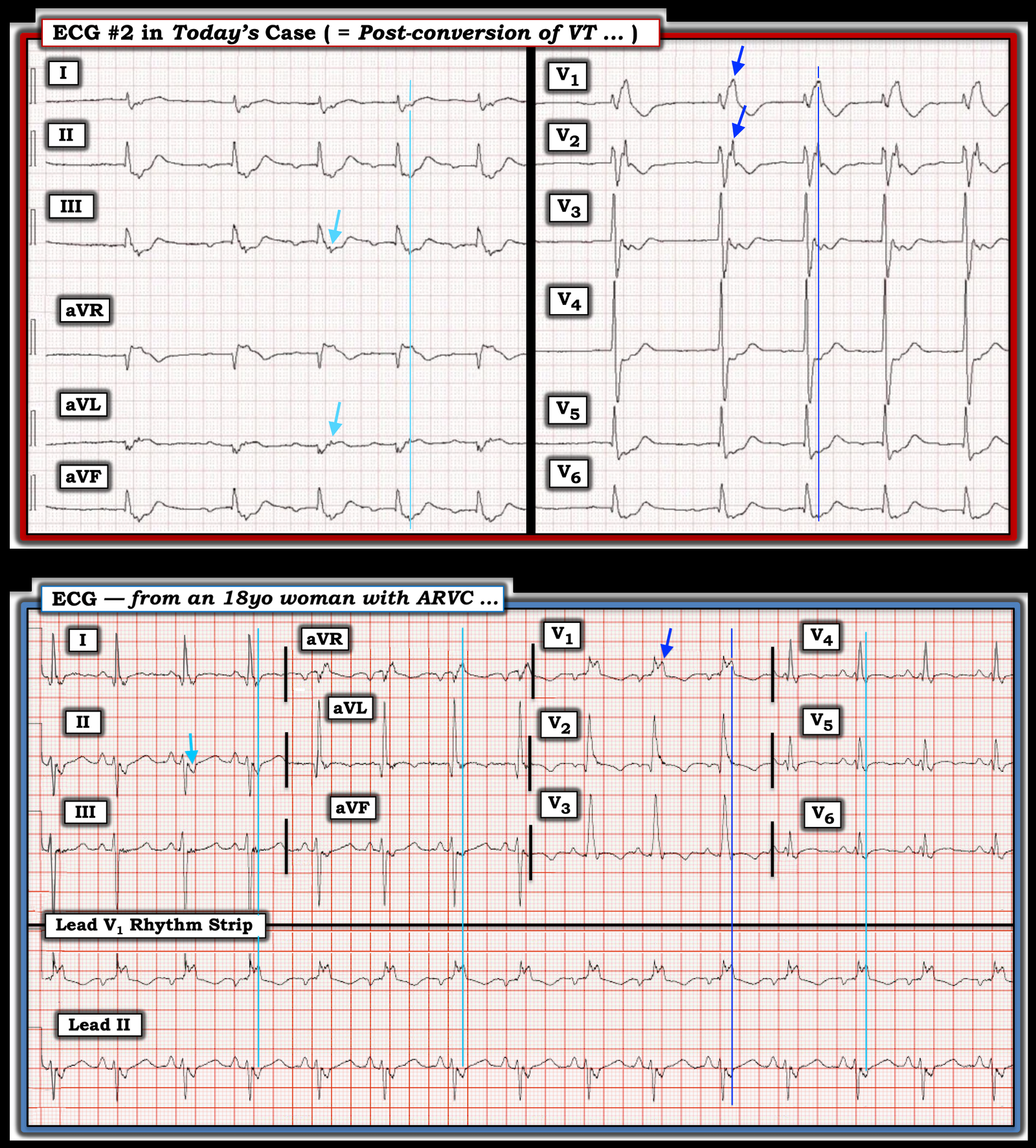 - By way of comparison — I’ve added the ECG from an 18-year old woman with documented ARVC to Figure-1, in which we see similarly huge Epsilon waves in multiple leads (this case taken from HERE). Seeing these 2 examples of huge Epsilon waves restores my faith that this is a real finding that we need to be looking for (especially in the post-conversion 12-lead ECG after resolution of sustained VT) — realizing that most of the time the Epsilon waves that we may observe will not be as prominent as they are in Figure-1.