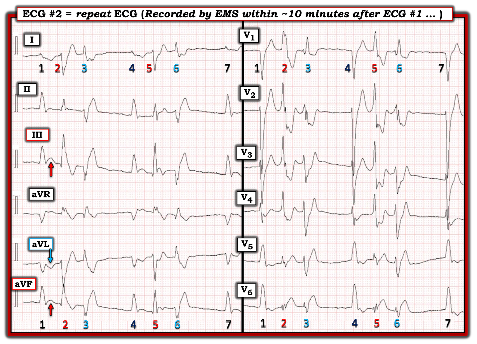 For clarity in Figure-1 — I’ve numbered the beats in this initial ECG with alternating colors. As per PEARL #1 above — there are only 10 beats in this tracing, with the format used providing us the advantage of seeing the QRS morphology for each of these 10 beats in each of the 12 leads!