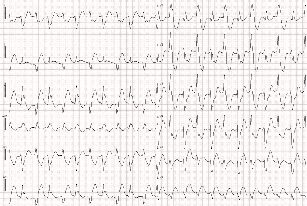 Interpretation: The above ECG shows a regular WCT with two distinct QRS morpholgies. This is not AFib with bigeminal PVCs, as the rhythm is regular. The QRS morphology in the above ECG is not consistent with LBBB (which was described as “baseline” for this patient). Instead, there is RBBB morphology, with an alternating left anterior fascicular block (LAFB) and left posterior fascicular block (LAFB) morphology. This ECG is consistent with bidirectional ventricular tachycardia, at a rate of about 125 bpm.