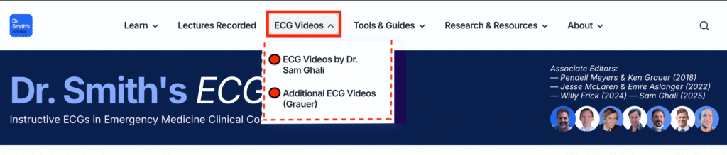 - NOTE: You can at any time easily find this video (and other ECG Videos by Dr. Sam Ghali and myself) under the “ECG Videos” tab in the Upper Menu at the top of every page in Dr. Smith’s ECG Blog!