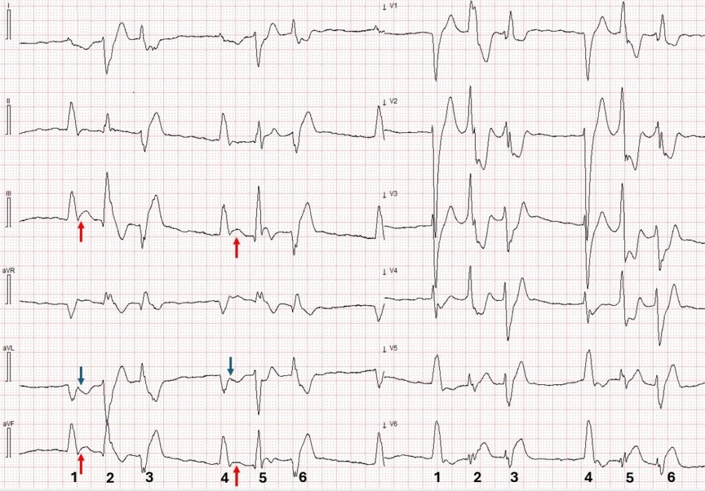 Same ECG as ECG #2. The rhythm is atrial fibrillation with beats #1 and 4 being supraventricular and conducted with LBBB abberancy. Beats #2 and 5 are PVCs with RBBB/LPFB morphology — while beats #3 and 6 are PVCs with RBBB/LAFB morphology. Red arrows point to concordant ST segment elevation and blue arrows point to concordant ST segment depression in natively conducted beats.