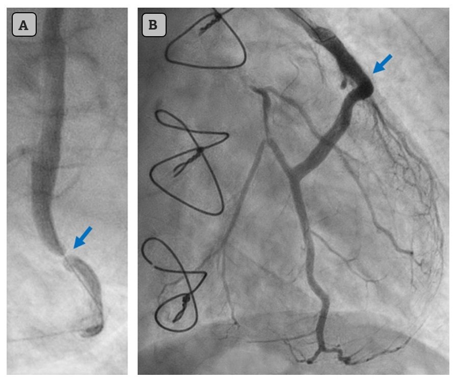 Arrows poiting to the culprit lesion before intervention (A) and after stenting (B).