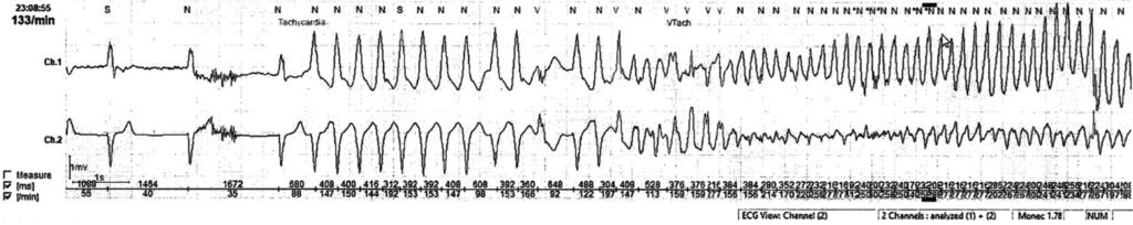 In today’s patient — BdVT resolved spontaneously so we do not know if the arrhytmia would have responded to cardioversion. Despite guideline-appropriate management, this patient experienced out-of-hospital cardiac arrest for which resuscitation was unsuccessful. This highlights the unpredictable nature of malignant ventricular arrhythmias — even with appropriate therapy. Noting the tragic outcome, one might question whether there had been an indication for ICD implantation in this octogenarian with ischemic cardiomyopathy and ventricular arrhythmia.