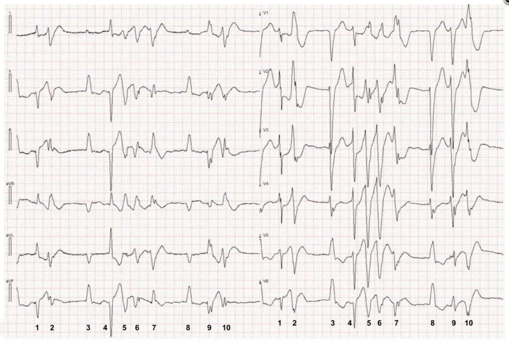 - Confession: Until I numbered the beats and remembered that limb leads and chest leads are simultaneously recorded — I was confused about which beats in the limb leads corresponded to which QRS morphology in the chest leads.