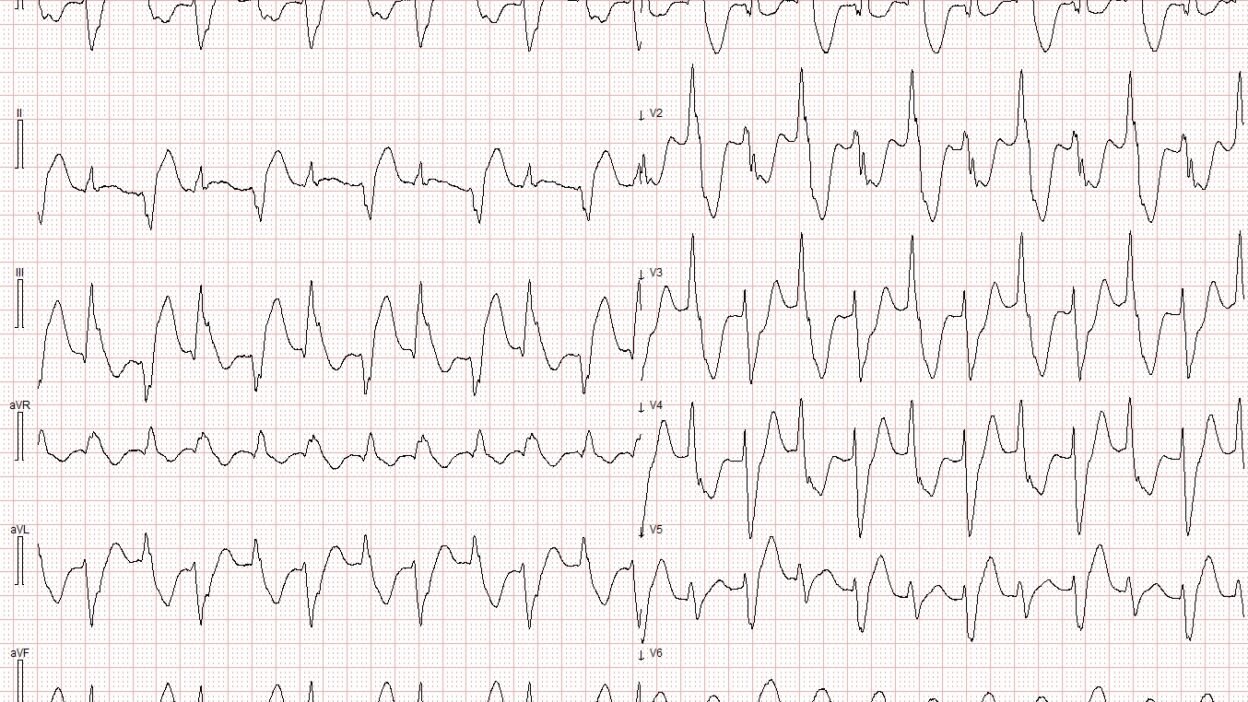 Interpretation: The above ECG shows a regular WCT with two distinct QRS morpholgies. This is not AFib with bigeminal PVCs, as the rhythm is regular. The QRS morphology in the above ECG is not consistent with LBBB (which was described as “baseline” for this patient). Instead, there is RBBB morphology, with an alternating left anterior fascicular block (LAFB) and left posterior fascicular block (LAFB) morphology. This ECG is consistent with bidirectional ventricular tachycardia, at a rate of about 125 bpm.