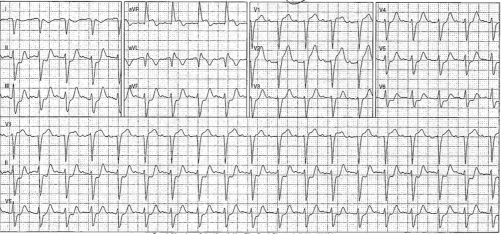 The intial ECGs in this case are indeed wide complex, with QRS durations in some leads over 120 ms. But it is not a left bundle branch block. As noted above, a left bundle branch block ECG must have monophasic R waves in leads I, aVL and V6.