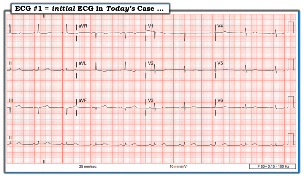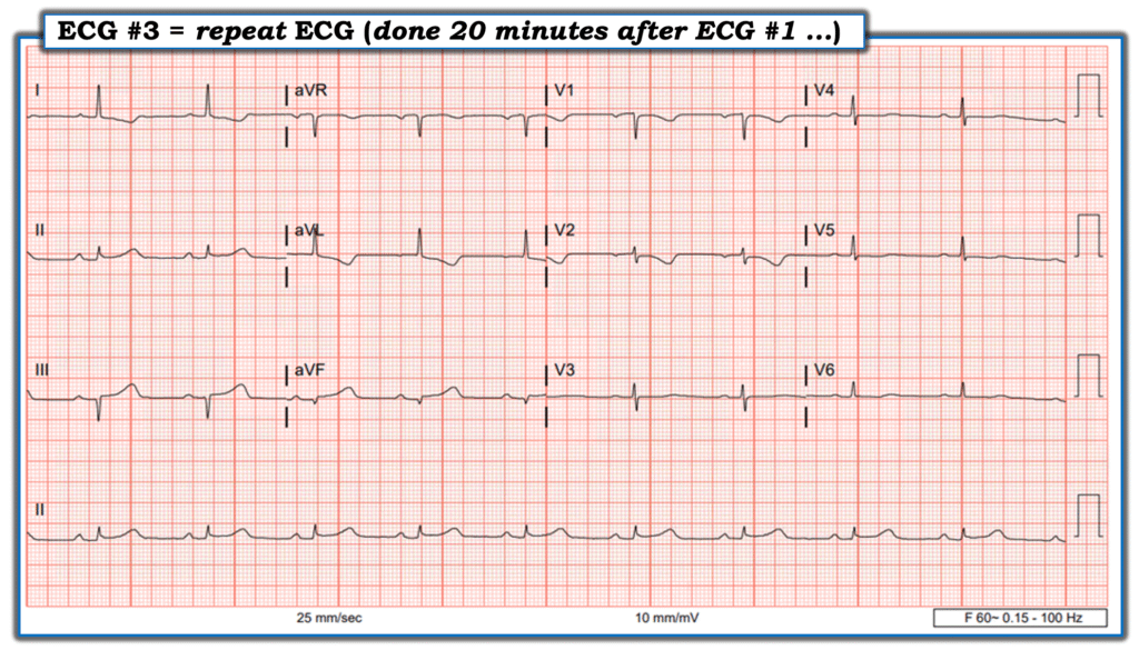 At that moment — I was called away to deal with a time-sensitive clinical situation. I asked for the patient to remain connected to the ECG machine for one more tracing, to be obtained after 10 more minutes. I returned to the room at that time to review this last ECG #3 — with this to be the last piece of data I observed before immediately activating the cath lab: