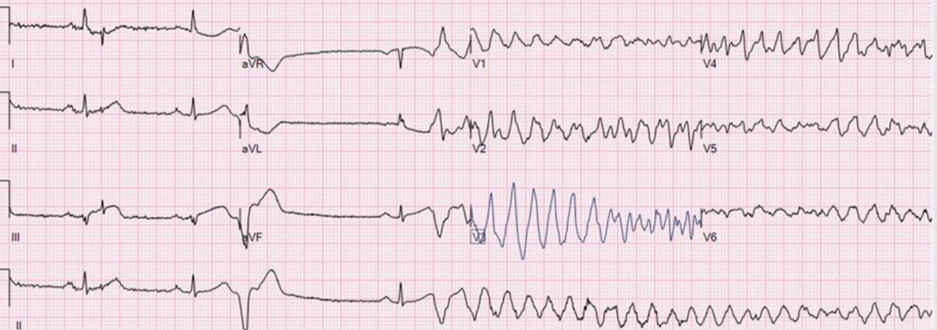 Emerson: The reason I thought of the above case from Mubarak Alhatemi — is because of what soon followed in that case — which was this rhythm below that was recorded while the patient was still connected to the ECG machine! Considering this abrupt onset of VFib in that case — I knew for today’s case, that I needed to find the best strategy in a “world of STEMI criteria” — in order to maximize myocardial salvage and minimize risk to my patient.