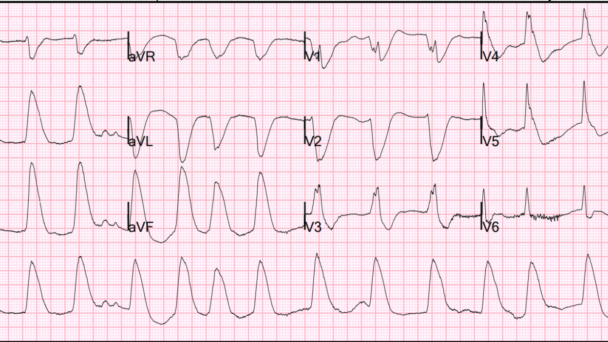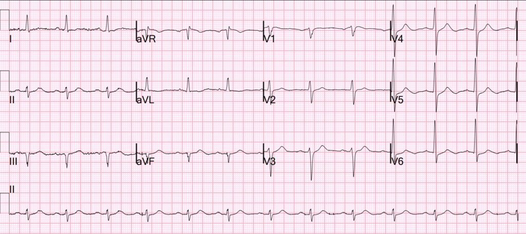 This ECG was sent to me only with the info that the patient had been stung by multiple bees. I responded: “Kounis syndrome”.