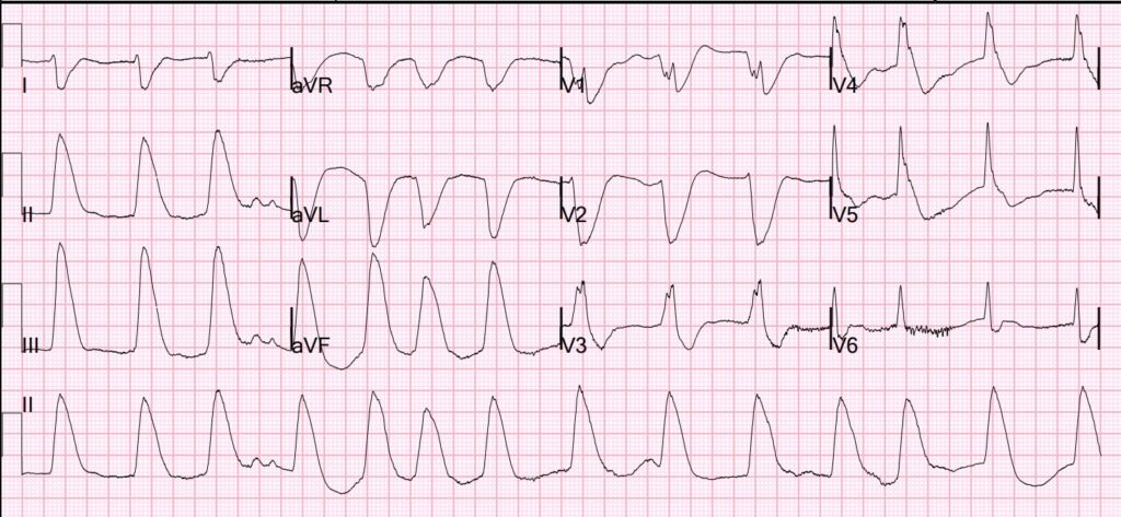 This is NOT a wide complex tachycardia. This is atrial fibrillation with “Shark Fin” pattern, an OMI pattern, and this time it is in the inferior leads, with posterior involvement shown by the inverted shark fin in V2. The end of the R-wave merges with ST Elevation, which slopes down. This has also been called “Giant R-wave”. Medics had seen this on the monitor and thought that it was ventricular tachycardia.