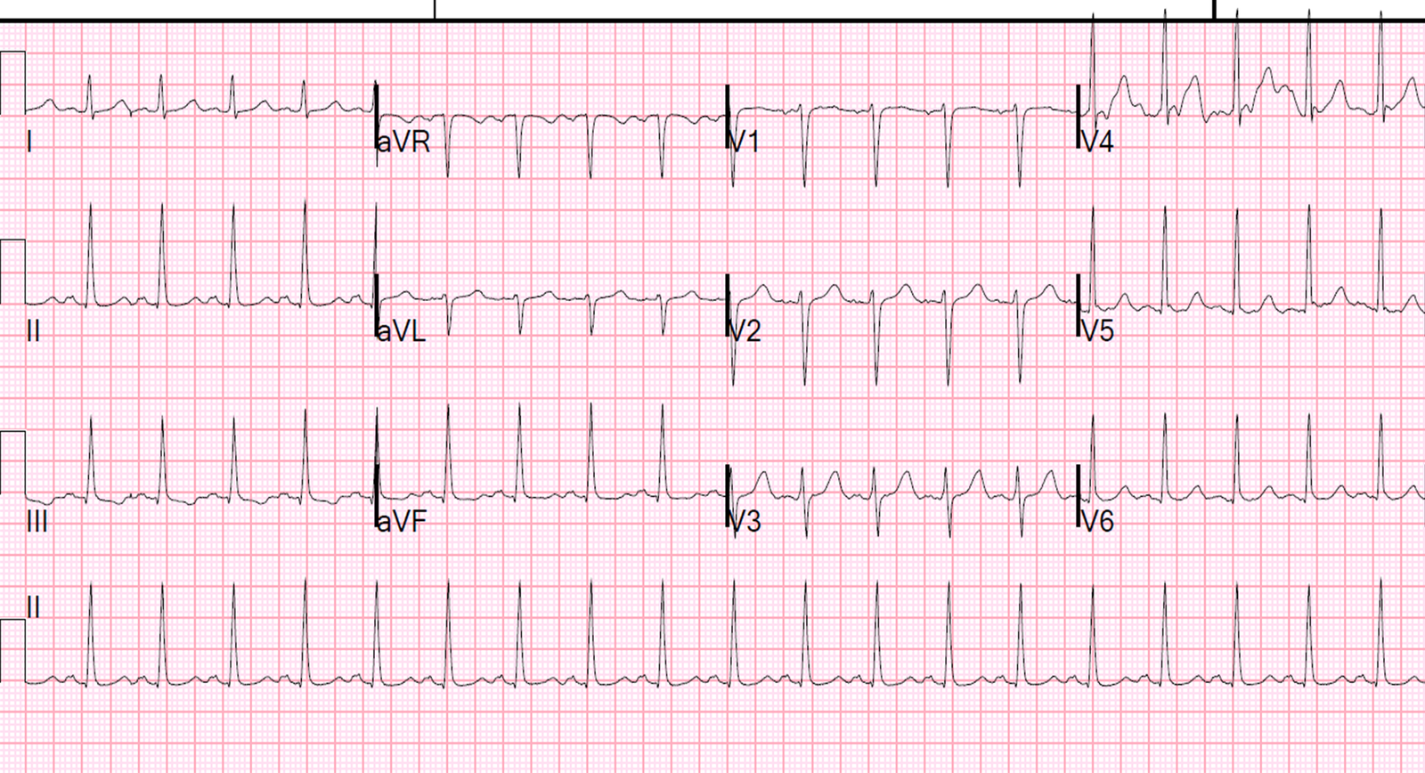 A patient with was resuscitated from respiratory and cardiac arrest of uncertain etiology, but because she was very difficult to ventilate with BVM ventilation, and there were no ultrasonographic slidings signs, pneumothorax was suspected and bilateral needle thoracostomies were placed. This ECG was recorded: