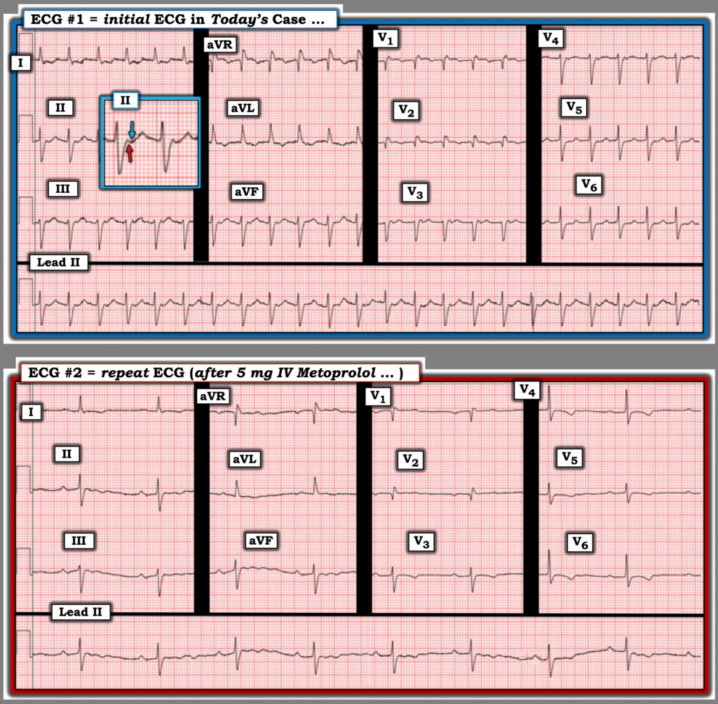 For clarity in Figure-1 — I’ve reproduced the initial ECG — with the repeat tracing below it (recorded after 5 mg IV Metoprolol successfully converted the rhythm to sinus).