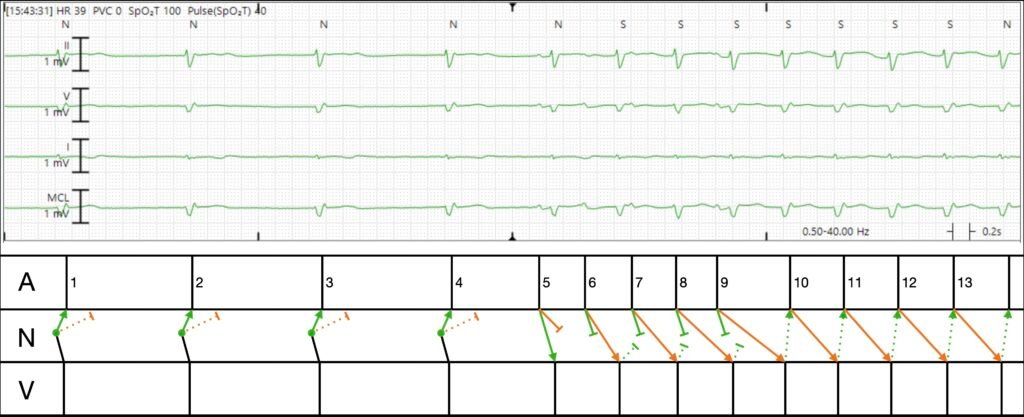 - The first four beats are junctional escape beats which conduct antegrade into the ventricle, and retrograde up the fast pathway (green). They also conduct up the slow pathway (orange), but since the fast pathway wins the race, the atrium is refractory and there is no evidence of slow pathway conduction on surface ECG. In the language of EP, we call this “concealed conduction.”