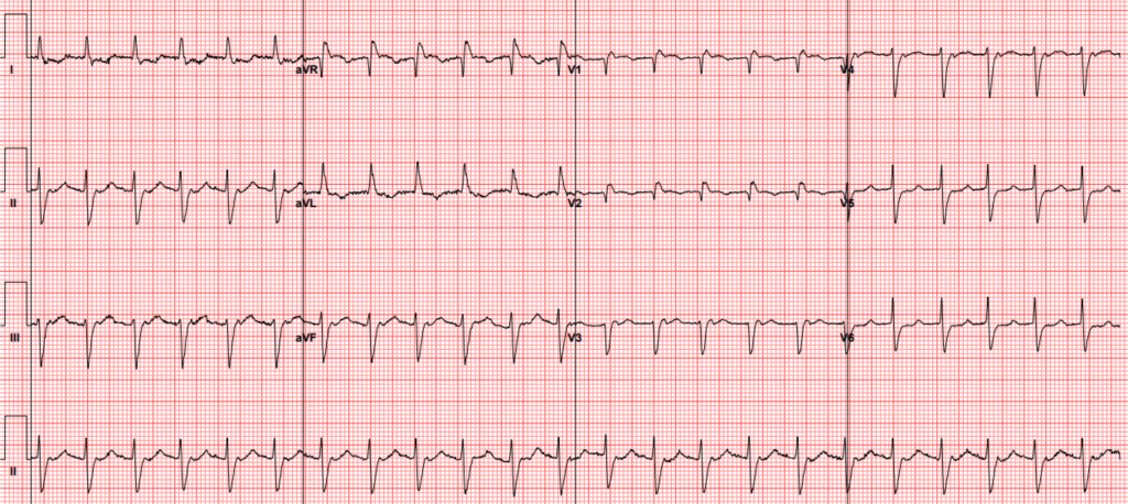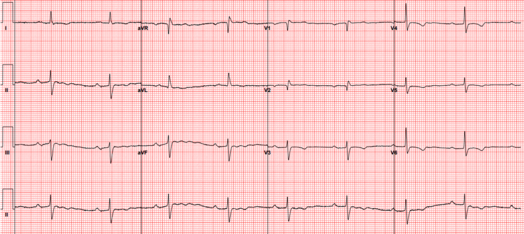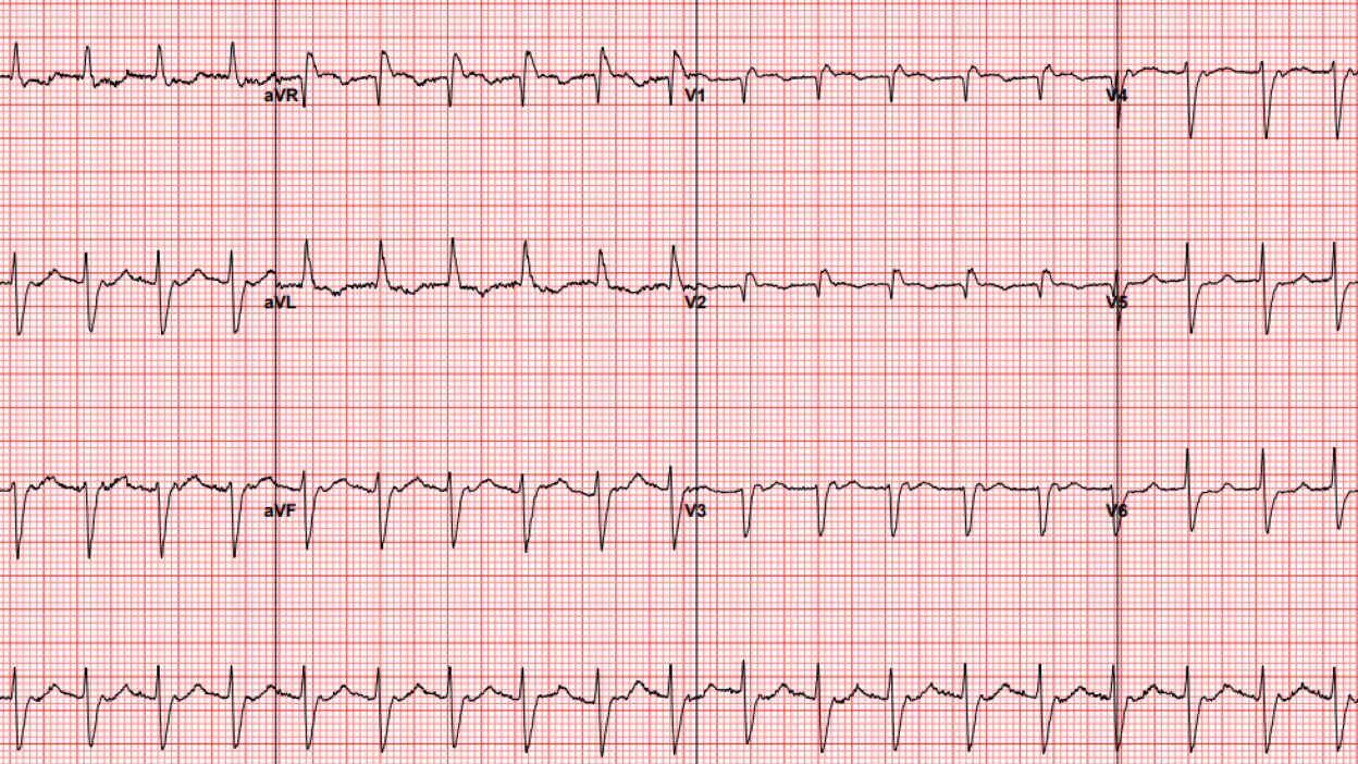 A woman in her late 70s presented with nausea, vomiting, and diarrhea. Her emergency department ECG is shown below: