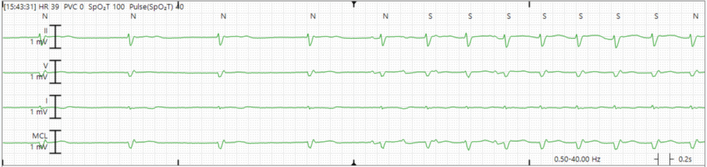 The patient was started on amiodarone and therapeutic anticoagulation, and discharged with outpatient follow up. Several days later, she presented with dizziness. ECG showed junctional bradycardia with heart rate in the 30s. Amiodarone was held and she was admitted.