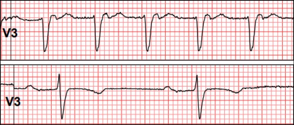 On review of her telemetry, her heart rate trend showed an abrupt change. The heart rate trend line is a very powerful tool to find interesting portions of telemetry, especially when there are abrupt rate changes.